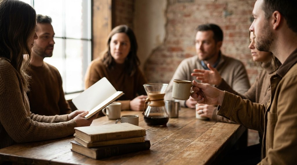 A small book club gathered around a table with coffee and an open novel at night