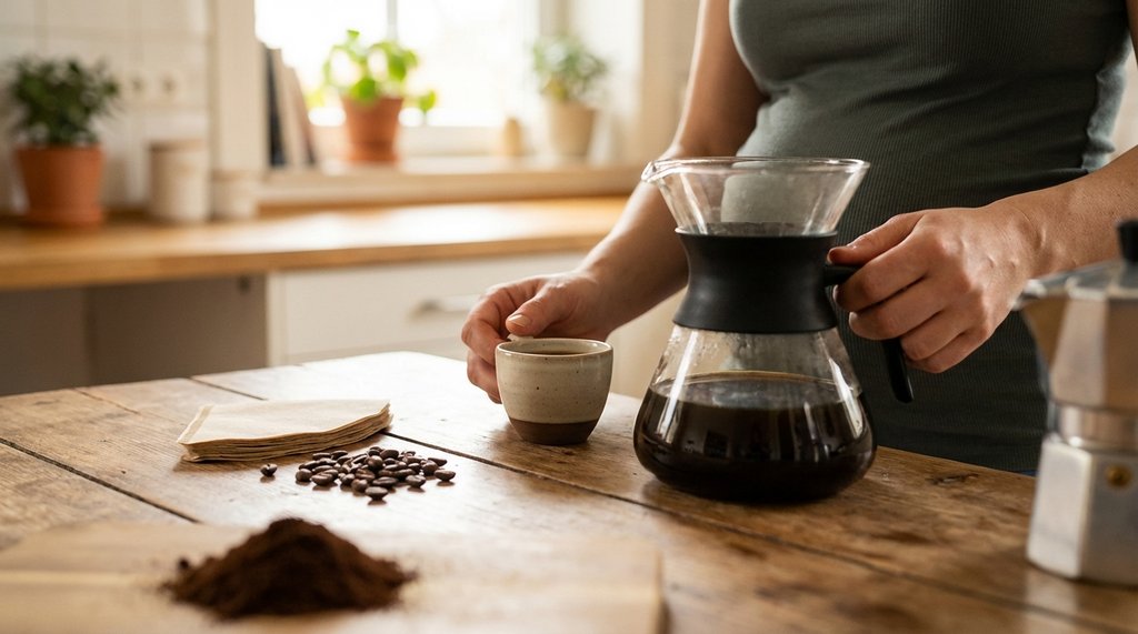 Brewing method also shifts the number meaningfully. French press at a 1:12 ratio for 4 minutes delivers 80-110mg per 8oz. Chemex and V60 pourover formats, because they typically use more coffee by weight and longer contact time, pull closer to 130-165mg per 8oz equivalent — and pourover devotees tend to brew in 12oz+ volumes by default. I’ve tested this with a TDS meter on the same beans brewed in French press vs. V60: the V60 consistently reads higher dissolved solids, which tracks with the caffeine extraction difference.