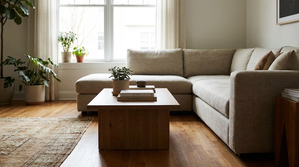 The rule that actually works for L-sectionals in sub-15 sqm rooms: size to the short end of the L, not the long run. If your chaise section is 155cm, you’re working with a table in the 90–105cm range. That feels counterintuitive — it looks undersized in a product photo — but in the room it reads correctly because the L itself creates visual bulk that a proportionally smaller table balances rather than competes with.