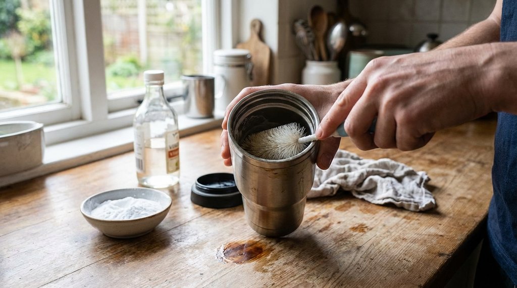 The problem is what people do with it. Combining baking soda with a bottle brush that has any stiff bristle texture — especially those cheap nylon bottle brushes where the bristle ends aren’t rounded — will leave hairline marks, particularly on the weld seam at the bottom of the cup. That seam is where the inner wall meets the base, and it’s slightly more exposed than the cylindrical sidewall. After a week of coffee use following a baking soda scrub with one of those stiff brushes, I could see under a phone camera macro lens that the staining was reappearing faster in the seam area than on the walls. The scratches were providing anchor points.